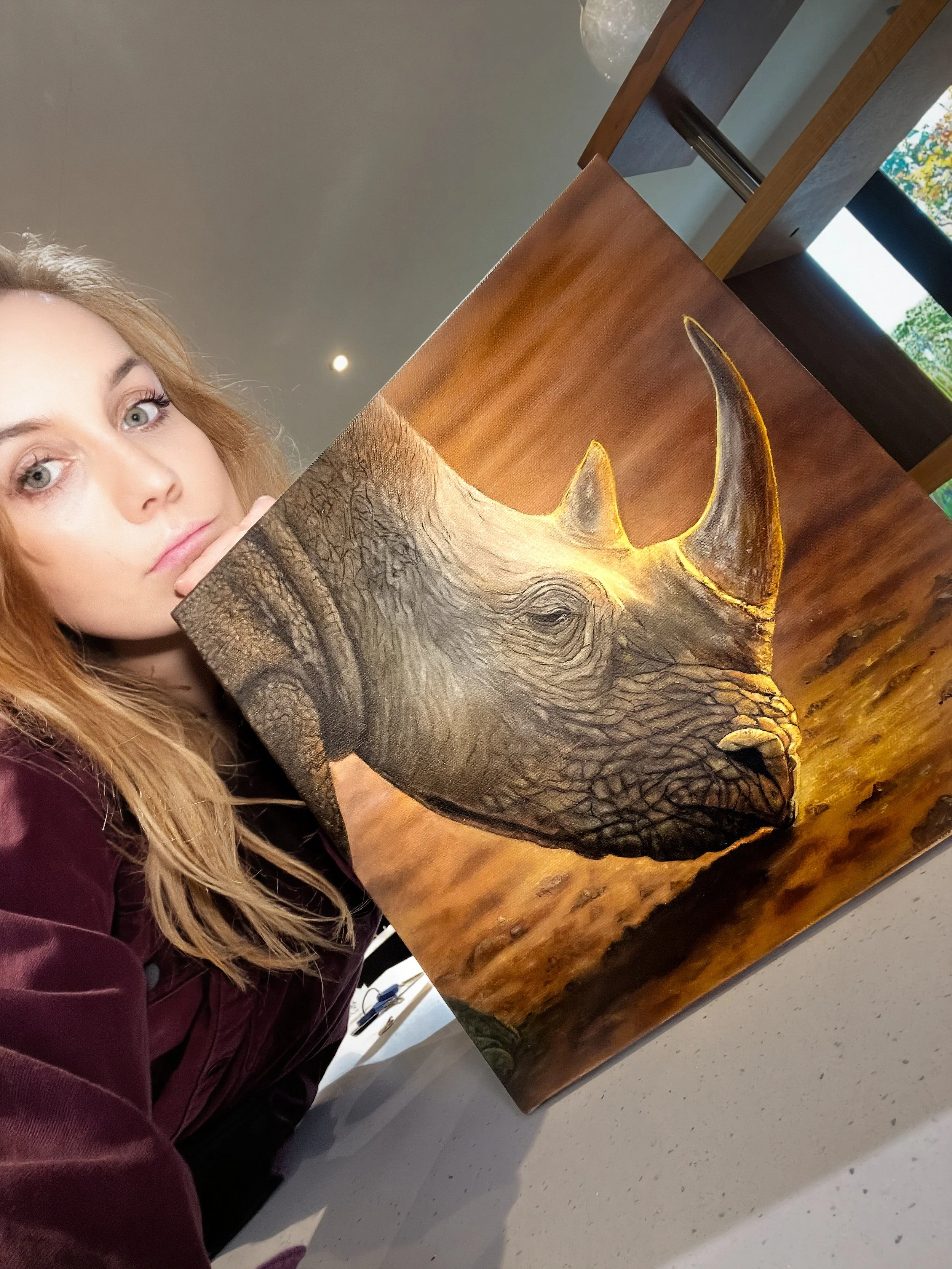 ‘Final Charge’ captures the strength and defiance of the black rhino, a reminder of both their resilience and fragility. Painted in oils with layered glazes and deep shadows, and bright sun-drenched highlights, I wanted to capture the heat of the desert and the barren lands in which theses magnificent animals live.